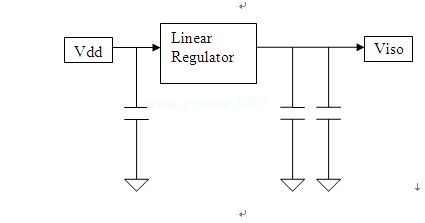 圖3:電源退耦。 為PLL供電時,電源隔離是非常重要的,因為PLL對噪音非常敏感,且對于穩(wěn)定系統(tǒng)來說,要求抖動非常低。你還必須選擇模擬或數(shù)字PLL,模擬PLL對噪音的敏感度比數(shù)位PLL低。 如圖4所示,具有低截至頻率的Π型濾波器經(jīng)常被用來隔離PLL與系統(tǒng)中的其它高速電路。一個較好的辦法是利用一個低壓差(LDO)電壓調(diào)整器來獨立產(chǎn)生PLL的電源電壓,如圖5所示。該方法雖增加了成本,但確保了低噪音和優(yōu)異的PLL性能。